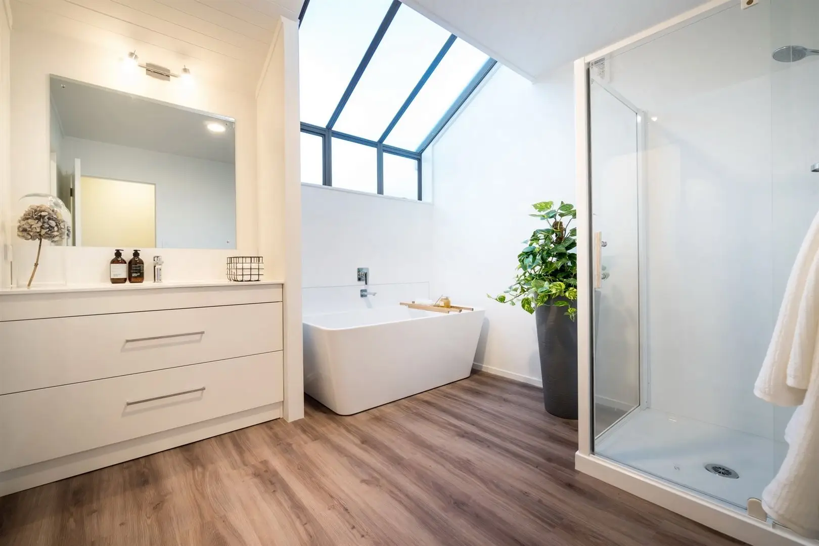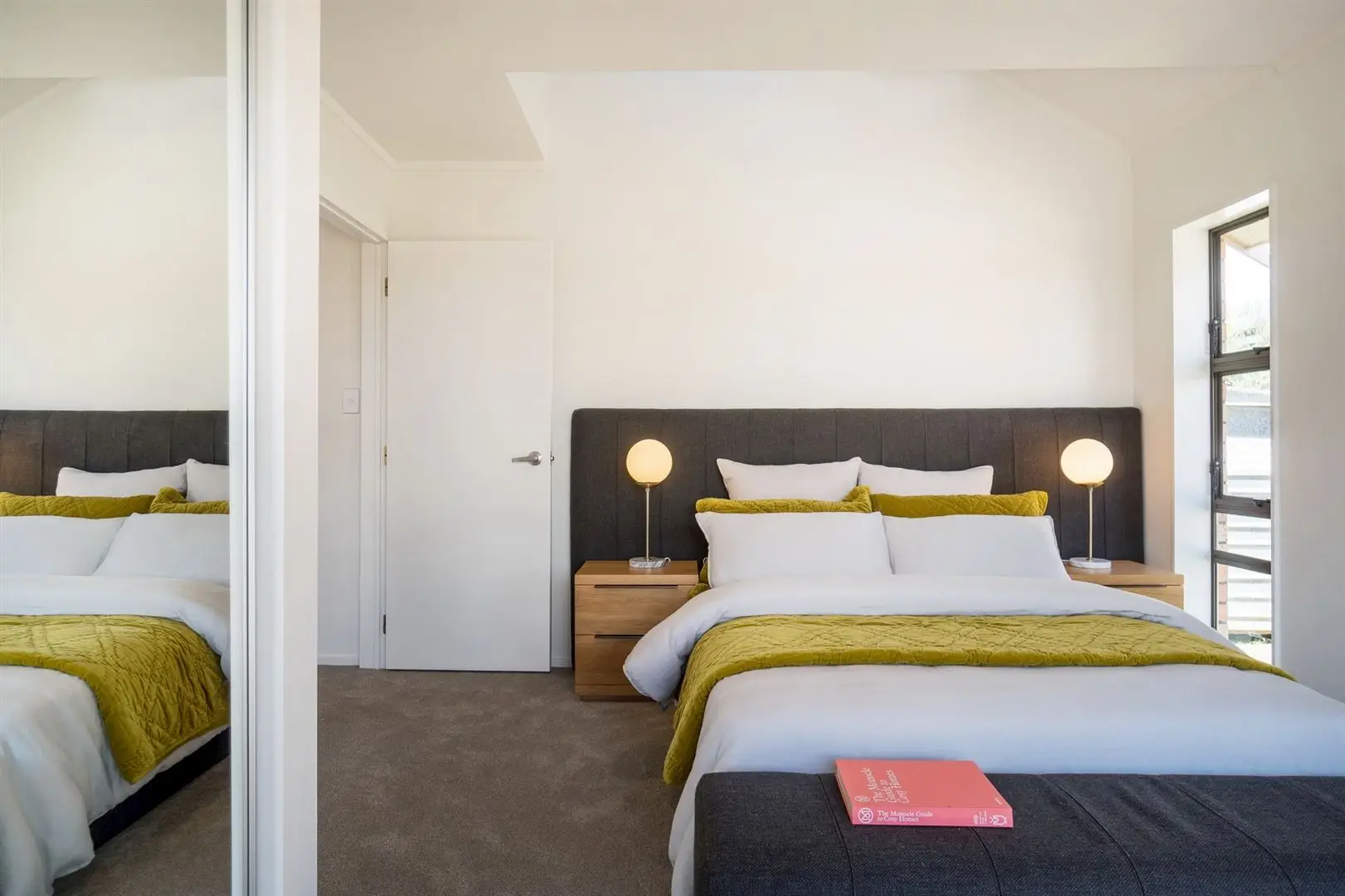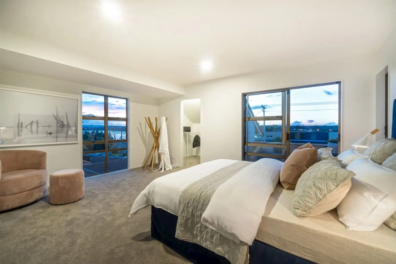 The two bedrooms on the ground floor both have sliding doors opening out to the front deck, and are serviced by the family bathroom. This has a separate toilet, large stand-alone bath and skylights overhead to illuminate the room. A feature light adds visual interest to the stairwell up to the two second level bedrooms and bathroom. Up here, the master suite has a private balcony and floor-to-ceiling window capturing views across Shoal bay and reserve, as well as a walk-in wardrobe. The other bedroom also has a walk-in wardrobe and enjoys views of the Sky Tower and Westhaven Marina from its elevated position.