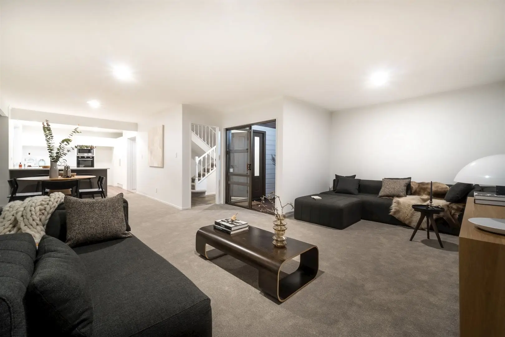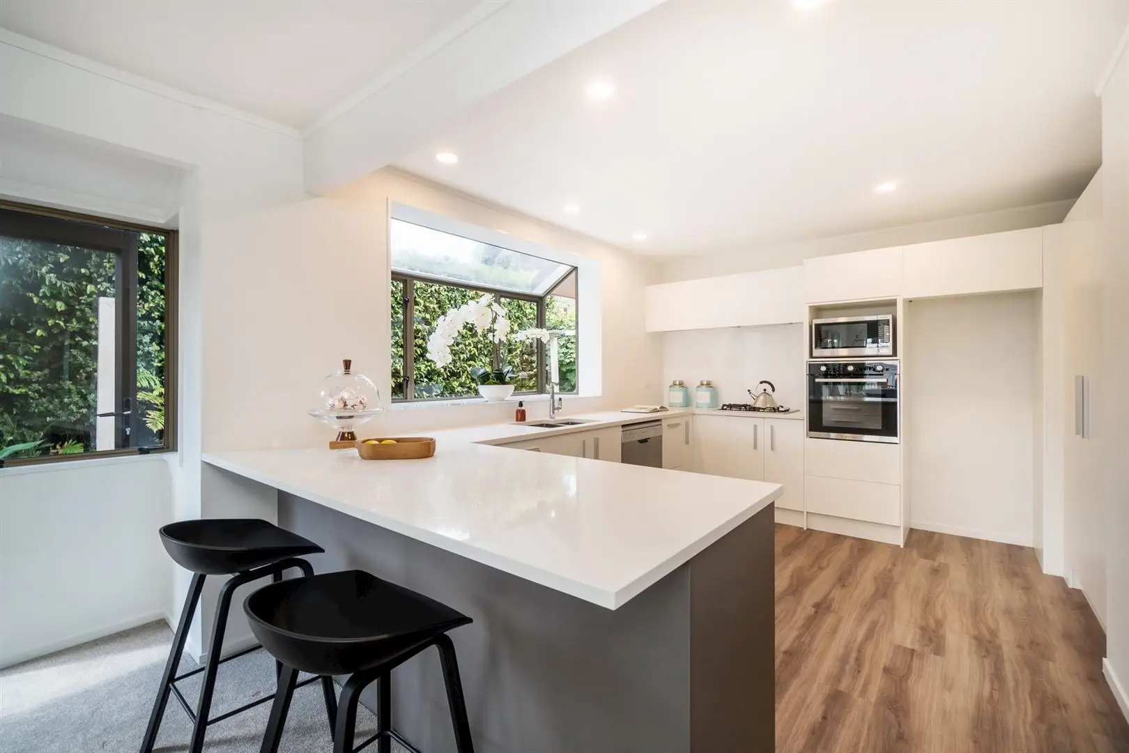 A flat, easy care section frames the home. It’s fully fenced and gated, so safe for kids and pets, and has a separate double garage onsite. Inside, the full renovation has beautifully brightened the light-filled rooms, creating gallery-style spaces for feature artworks. Plush new carpets are complemented by a contemporary, neutral palette and multiple sets of doors and windows frame the leafy green, garden outlook. Entry level is on the ground floor, with the tiled foyer flowing into the open plan lounge and dining zones. The brand new kitchen features white cabinetry, stone benches, a gas cooktop and a breakfast bar. Mature hedges create an excellent sense of privacy outside, where simplistic, tropical plantings frame an intimate deck. A paved pathway follows around the rear of the property to another area of lawn on the other side.