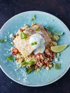 9. Cover the pan with a lid or tin foil, and cook on a low heat for 12 to 15 minutes, or until the couscous has fluffed up and the salmon is just cooked.