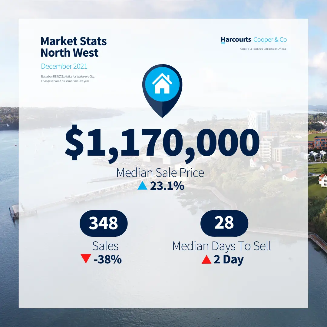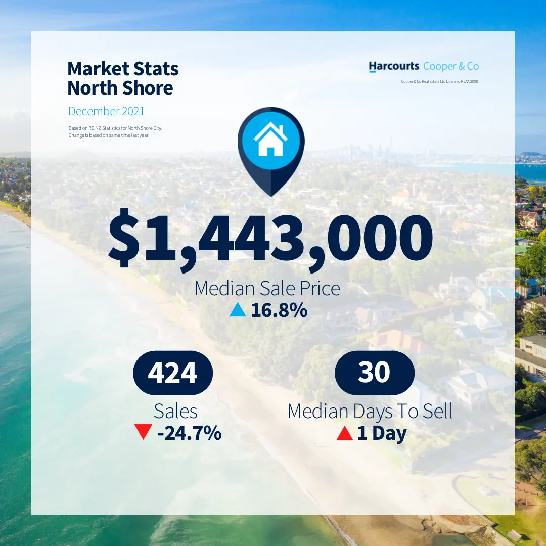 The property market closed out 2021 with strong sales volumes & prices. The North Shore median sales price of $1,443,000 was nearly 17% ahead of December 2020. Volumes, whilst remaining above long-term averages, were down when compared to the prior month and prior year with 424 North Shore sales in December.