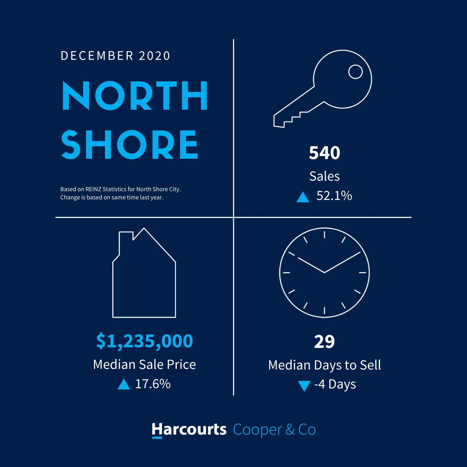 North Shore sales volumes increased 52% in December with 540 sales for the month, producing a new record median price of $1,235,000, up 17.6% on December 2019. The median days to sell reduced to 29.