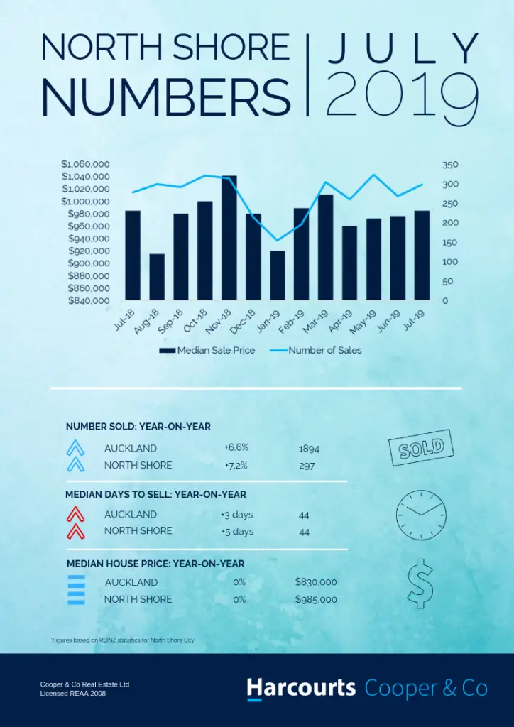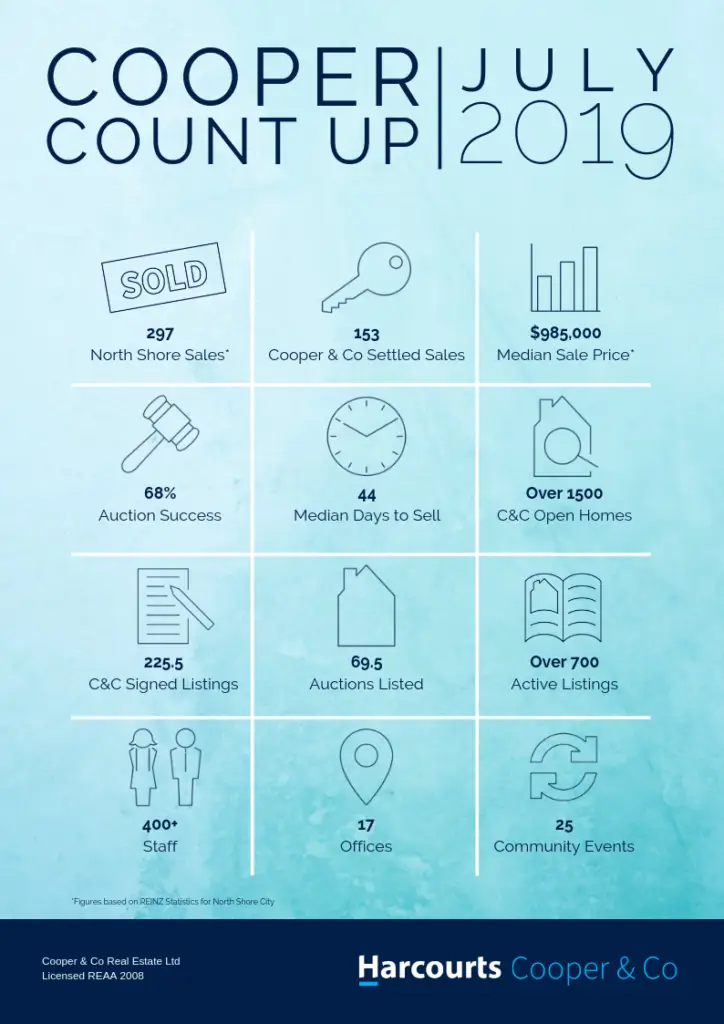 Market indicators continue to point towards confidence moving forward. In July North Shore prices remained steady and volumes increased. At Harcourts Cooper & Co, our monthly auction success rate increased to 68% with an average of 2.2 bidders per auction.