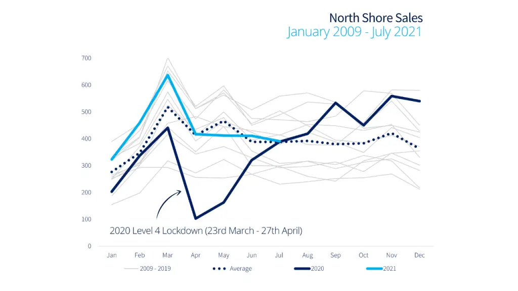 Speculations are rife as to what impact the current lockdown will have on the property market. If history is anything to go by, we would see activity plummet during a level 4 lockdown as it did in 2020 and then increase rapidly in the months following. Last year we saw the lowest volumes on record during lockdown, followed later in year by some of the highest volumes as depicted on the North Shore sales volumes graph below.